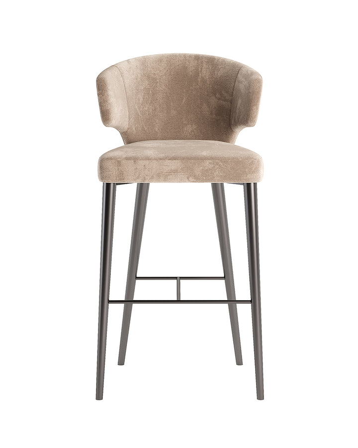 The ARVANA Bar Chair redefines elegance through gentle curves and refined textures. Its semi-circular backrest and soft velvet upholstery rest upon slim metal legs that provide both balance and grace. Designed to blend comfort with a sculptural silhouette, ARVANA is the embodiment of contemporary luxury for sophisticated kitchen and bar interiors.